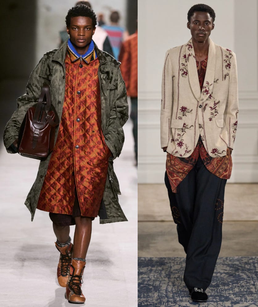 I want to see men explore florals on their lapels. Maybe a Dahlia or something. A lot of the men’s runways have soft floral motifs for fall, as seen at Dries and Kartik Research. Suiting is not going anywhere, and while it rarely feels tired, a boutonnière offers a subtle way to refresh it.