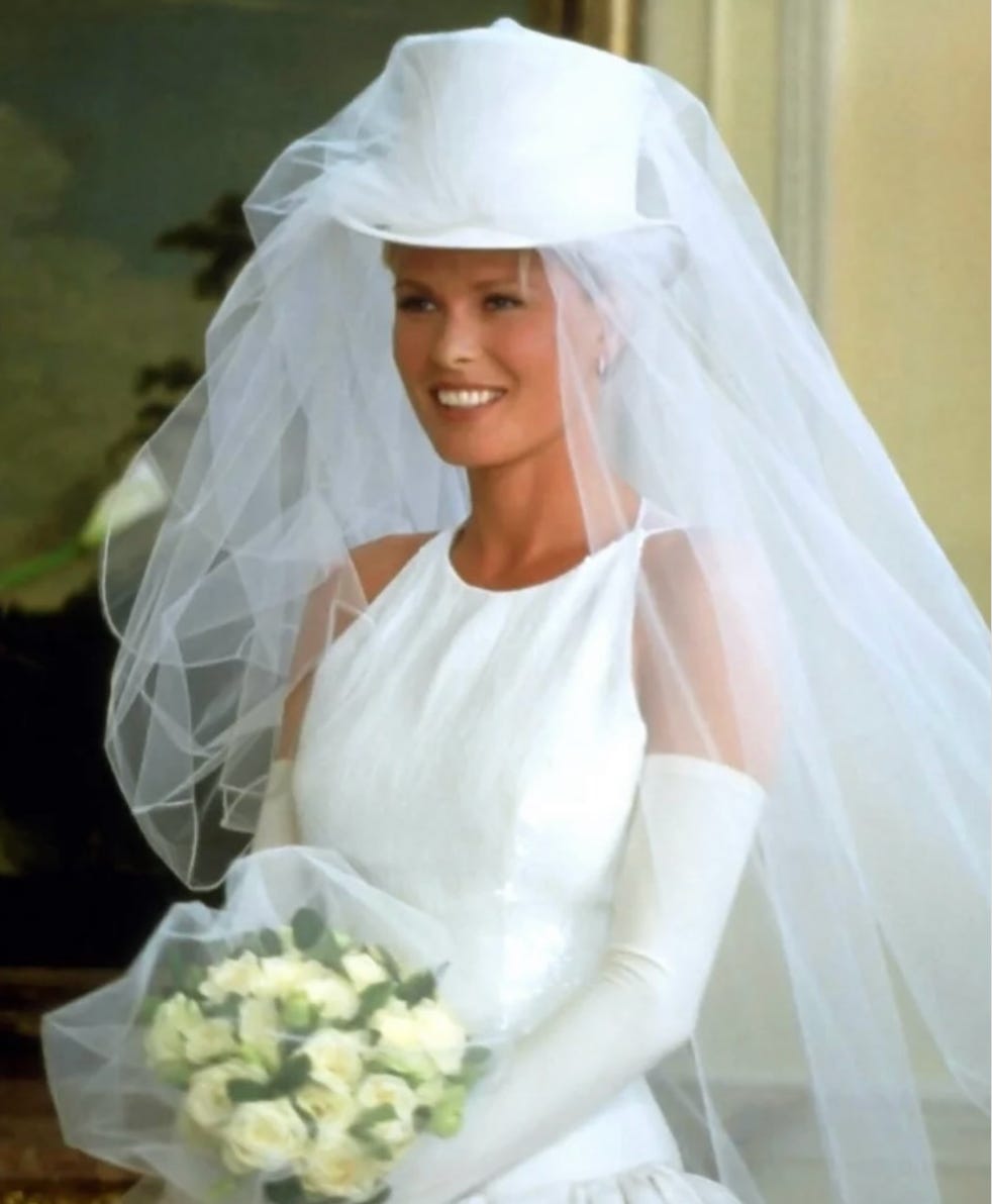 I very nearly wore a top hat to my wedding, influenced as much by the bridal gown model played by Vendela Kirsebom in 1998 Parent Trap as by T-Pain’s early-2000s tiger print or brocade iterations in differing heights, many of which can be seen in his incredible “Can’t Believe It” video featuring Wayne. A few wonderful hat makers who specialize in top hats either didn’t have the right fabric or weren’t able to make the hat in time for the wedding. That said, I recently purchased a sequined vintage YSL top hat–bucket hat hybrid, and I will say YSL has some of the best vintage hats that are both objectively ridiculous and completely fantastic. A leopard bowling hat! A yeti-fur conductors hat!